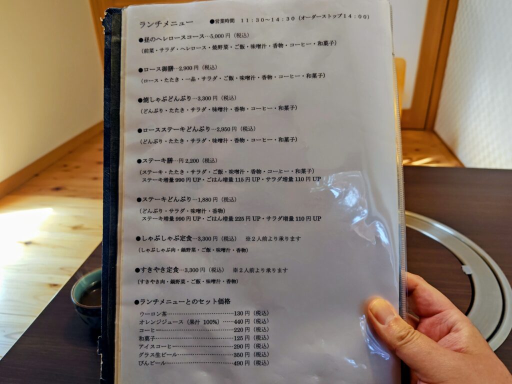 ランチメニューは昼のヘレロースコース、ロース御膳、焼きしゃぶどんぶり、ロースステーキどんぶり、ステーキ膳、ステーキどんぶり、しゃぶしゃぶ定食、すきやき定食にドインク類。
