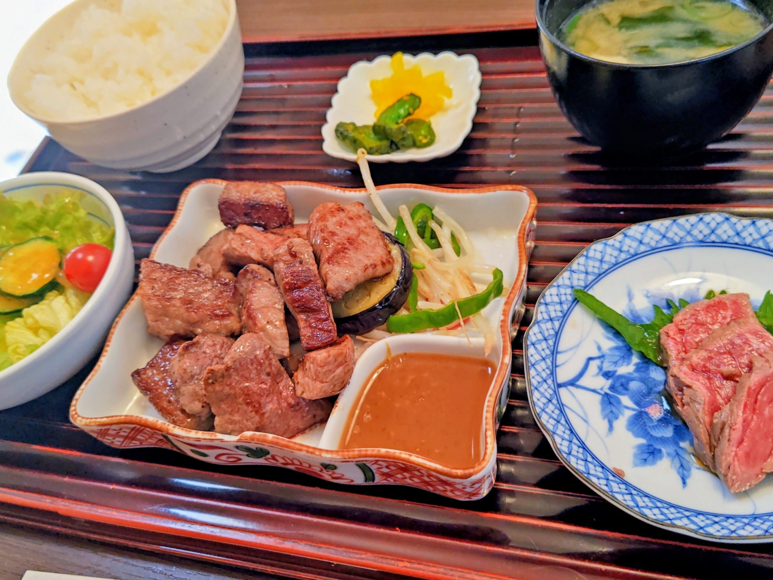 黒毛和牛ステーキ、たたき、サラダ、ご飯、味噌汁、香物、コーヒー、和菓子の充実のセット!