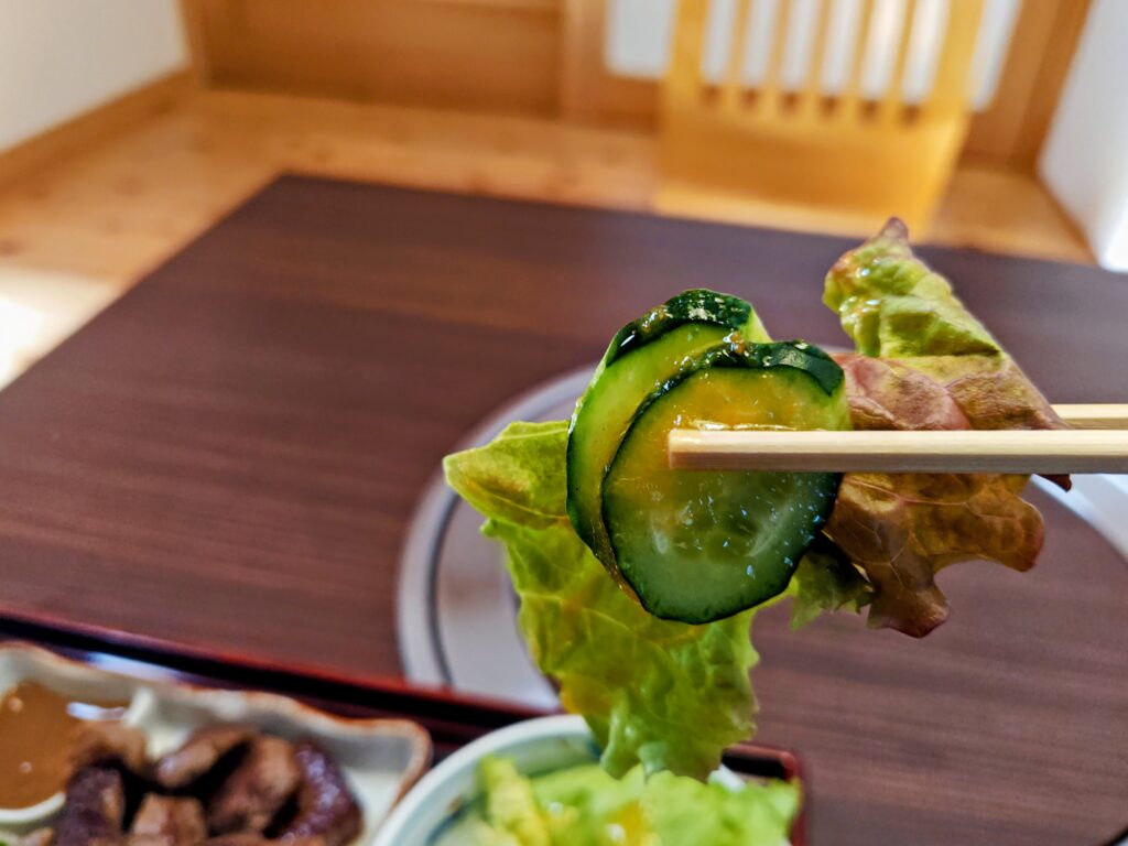 酸味の効いたドレッシングで肉の間によい箸休めにもなります。