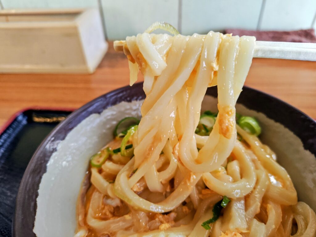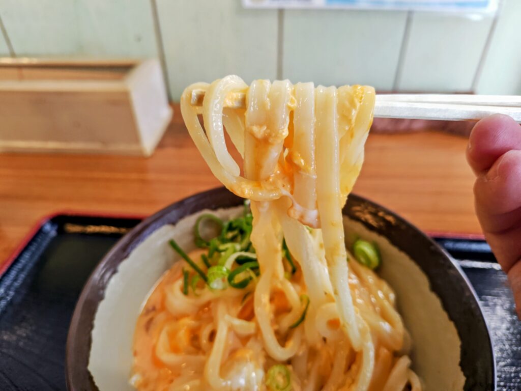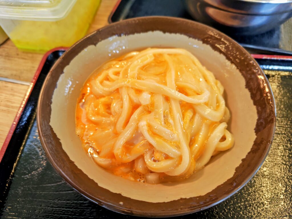 更に溶き立ての玉子が、うどんの余熱で見事なカルボナーラ状態にコーティング!