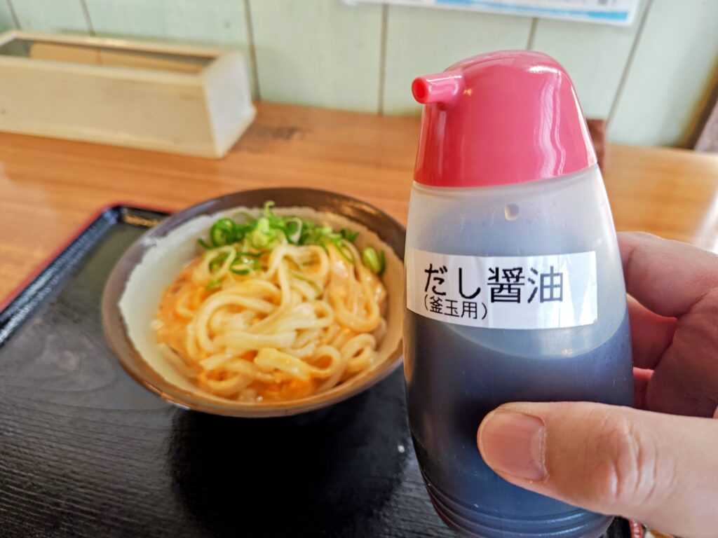 特製だし醤油が釜玉うどんに絡み、これこそが完成形!