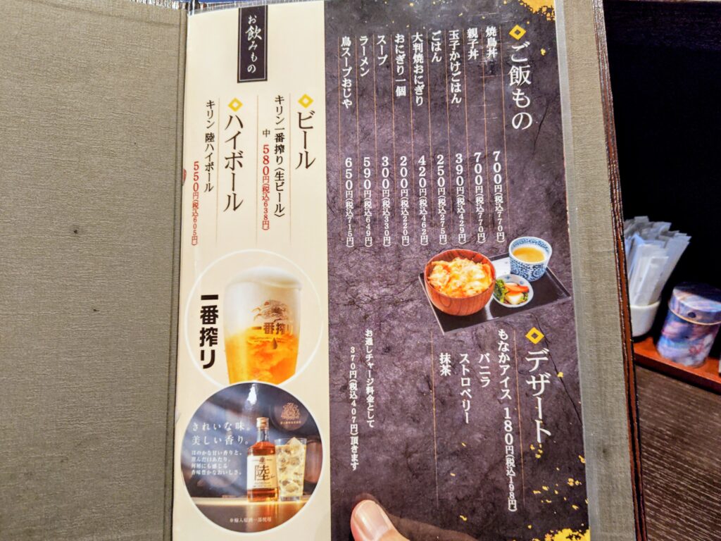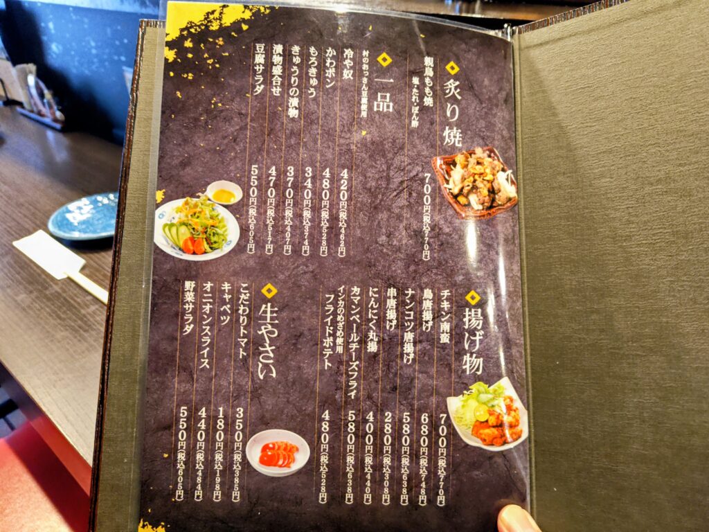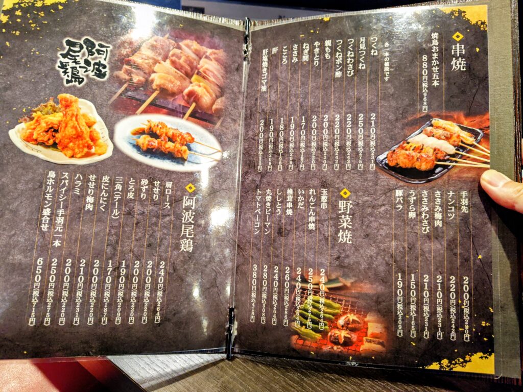 メニューは串焼、野菜焼、阿波尾鶏、炙り焼、一品、揚げ物、生やさい、ご飯もの、デザートのライナップ。