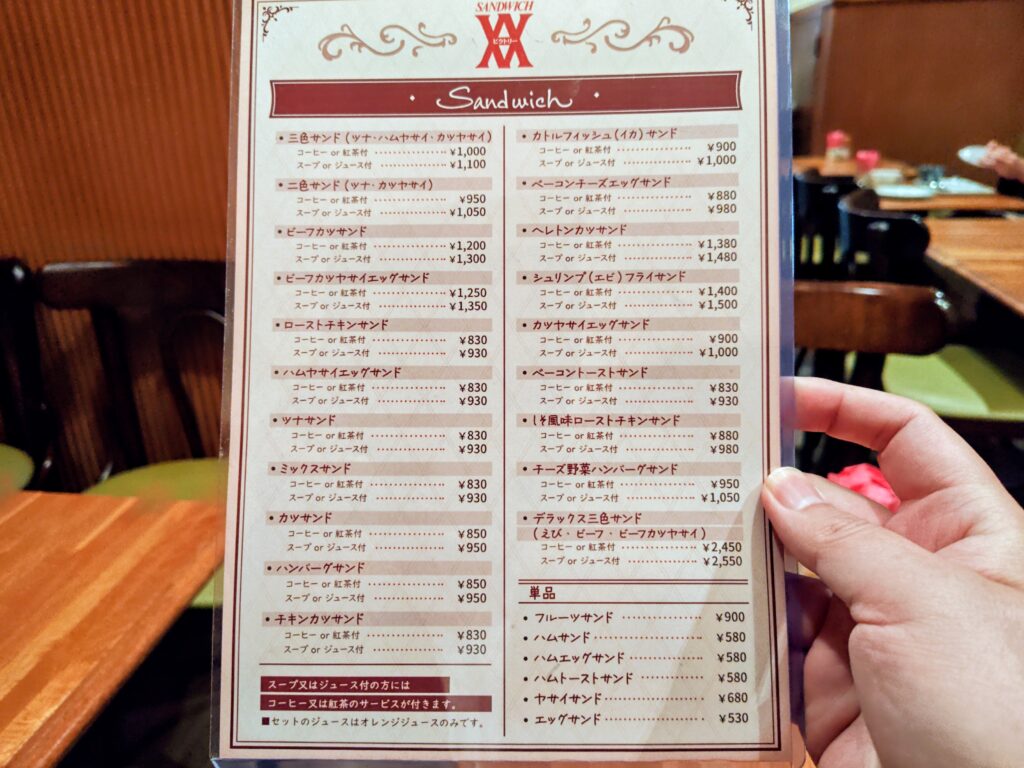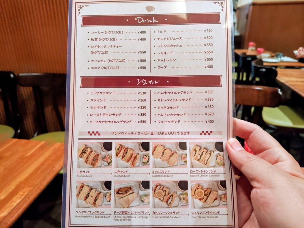 コーヒーor紅茶付、スープorジュース付、サンドイッチ単品(6種)、ドリンク単品(11種)、1/2サンド単品(10種)とお腹具合と好みでチョイスできる多彩なラインナップです。