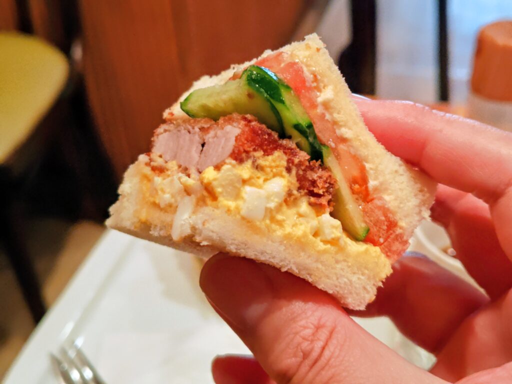 メイン具材が揚げたてサクサクのカツに変わり、カツが肉厚な分まで食べやすいように他サンドに比べ半分にカットされています。