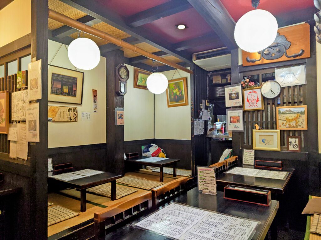 全席喫煙可、全22席(カウンター2席、テーブル席4人×3、小上がり4人×2)民芸そば処の名前にぴったりな店内です。