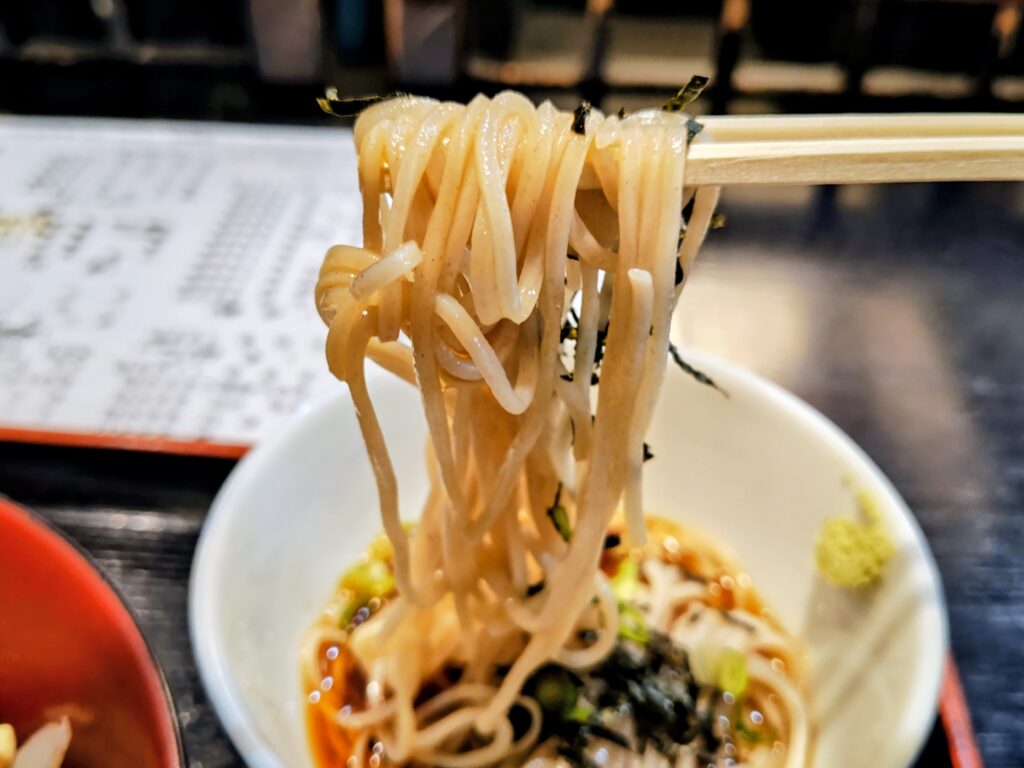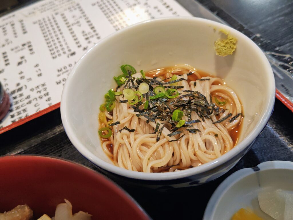 甘めの出汁に刻み葱、刻み海苔、山葵と喉越しよい蕎麦です。