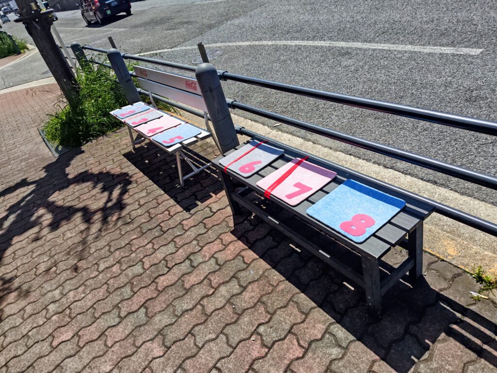 椅子後ろに横移動できるスペースはなく、外待ち椅子の番号と店内カウンター席番号が連動しています。