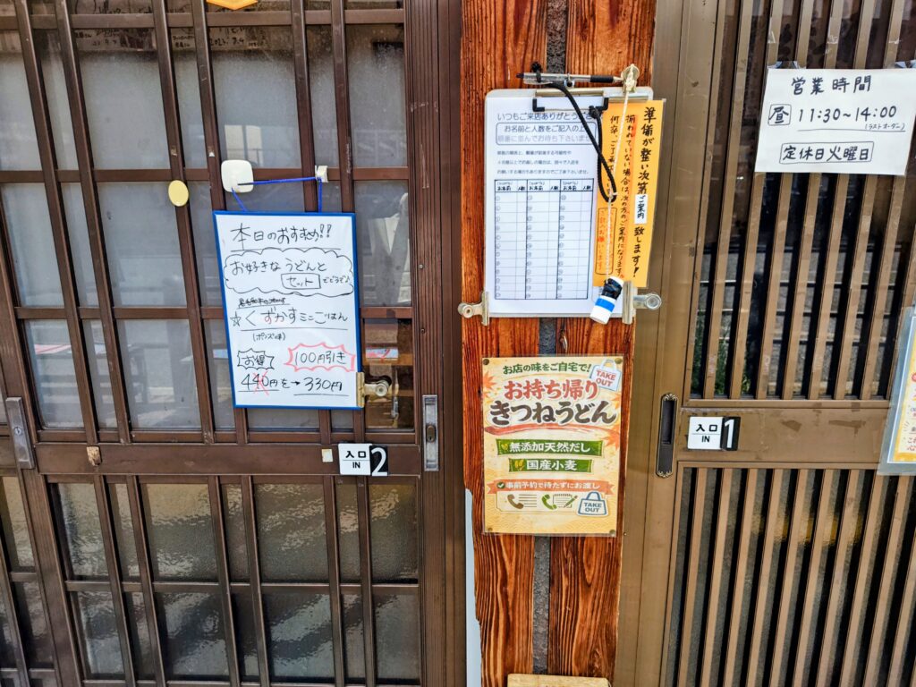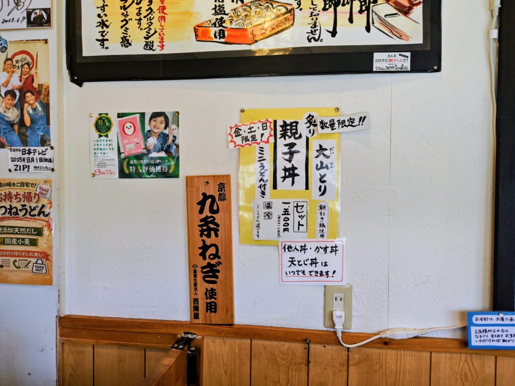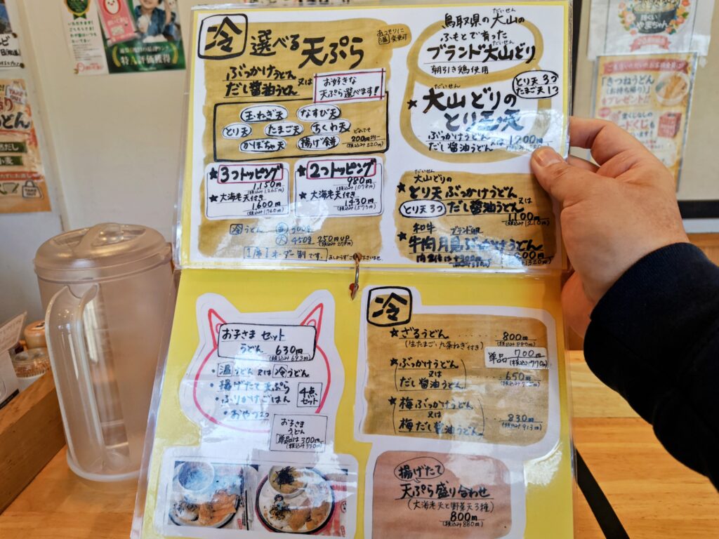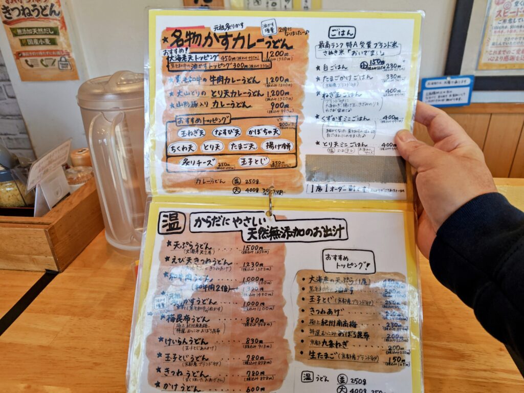 メニューはカレーうどん、温かいうどん、冷たいうどん、お子さまセット、ご飯類にトッピング。