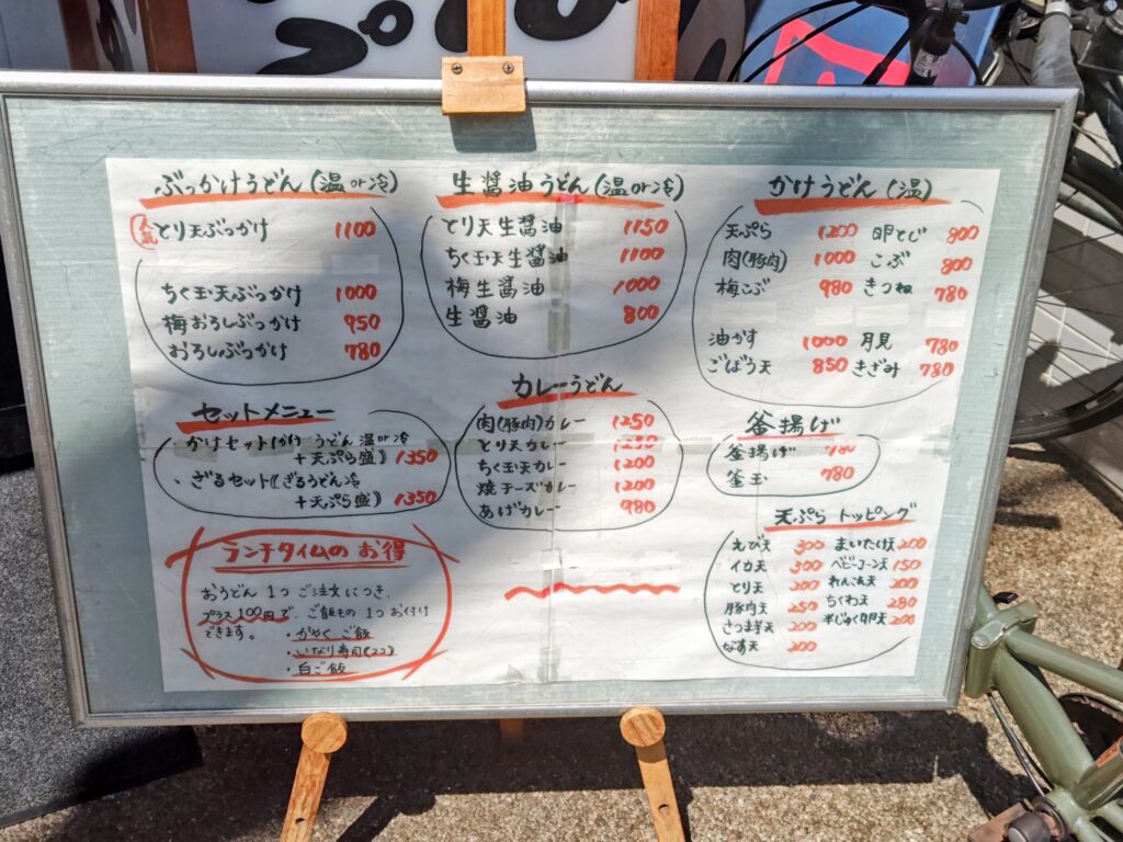 メニューはぶっかけ(温冷)、生醤油(温冷)、かけ(温)、セット、カレー、釜揚げにトッピング!