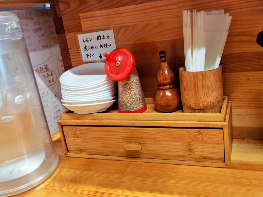 卓上には味変の白胡麻、七味唐辛子。