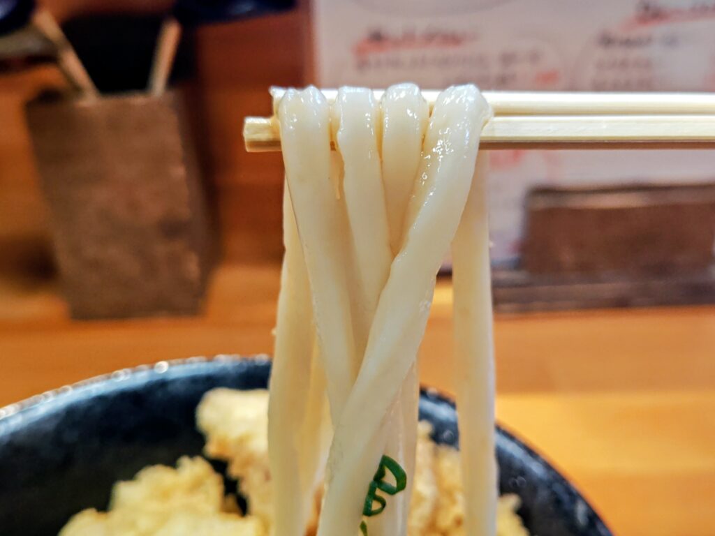 表面ツルツルのコシの強さにモチモチの弾力の旨うどんです。