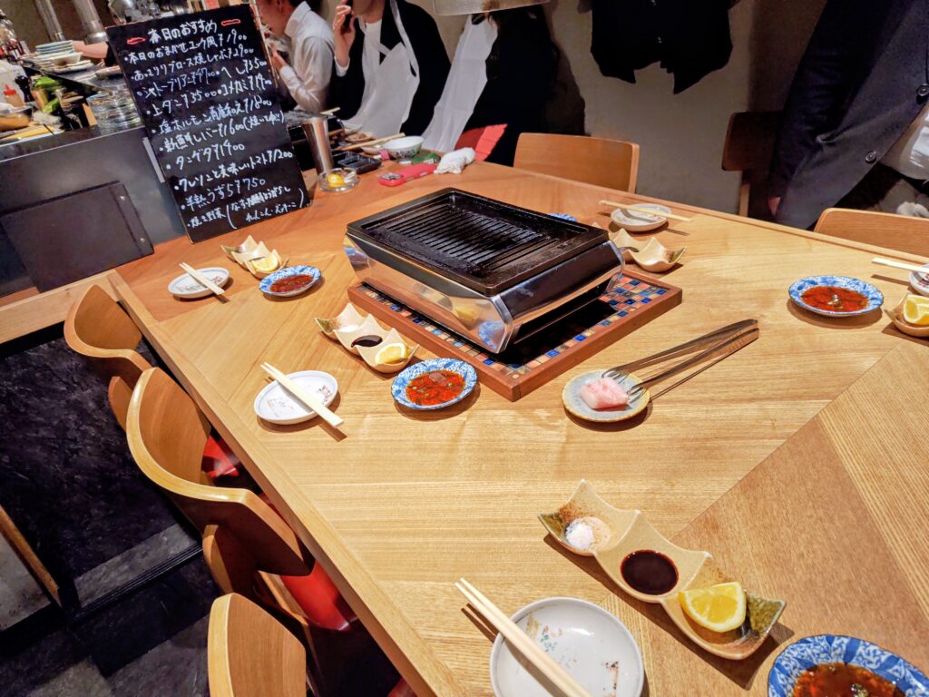 各自の席のお皿に岩塩、特選醤油タレ、レモン、特製タレがスタンバイ。