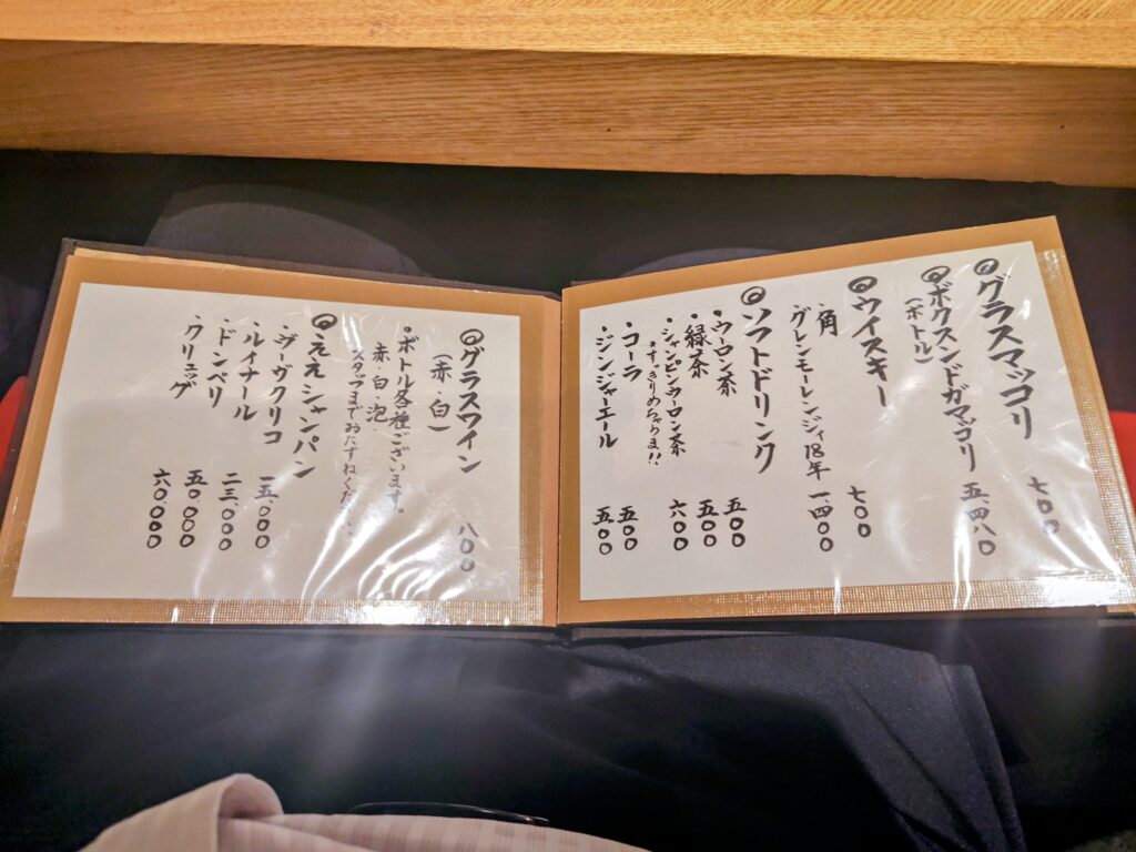 ドリンクメニューは生ビール、酎ハイ、焼酎、マッコリ、ウィスキー、ソフトドリンク、ワイン、シャンパンのラインナップ。
