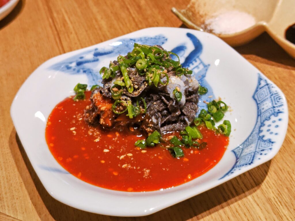ハツ刺し同様に新鮮で丁寧な下処理がされており、独特のコリコリ食感にチョジャンのピリ辛さにドリンクが進みます。
