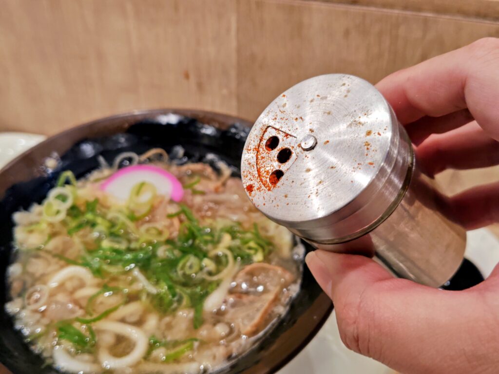 うどんをすすり、油かすを味わい出汁を飲むの無限ループ!味変は卓上の一味を一振り!