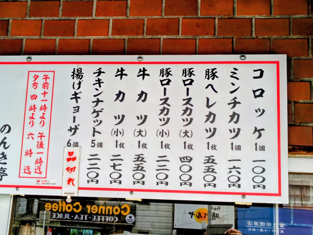 メニューはコロッケ、ミンチカツ、豚ヘレカツ、豚ロースカツ大小、牛カツ大小、チキンナゲット!