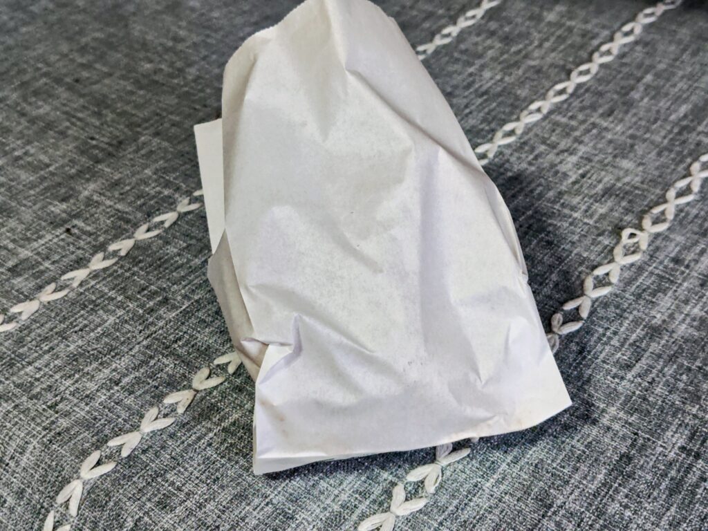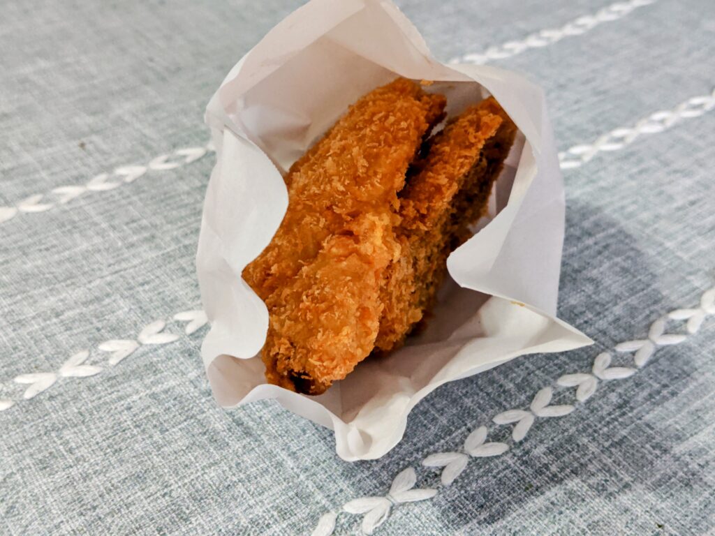 揚げたてのお持ち帰りで紙袋の口を開けて帰宅していますが、驚いた事に紙袋が汗をかいていません。