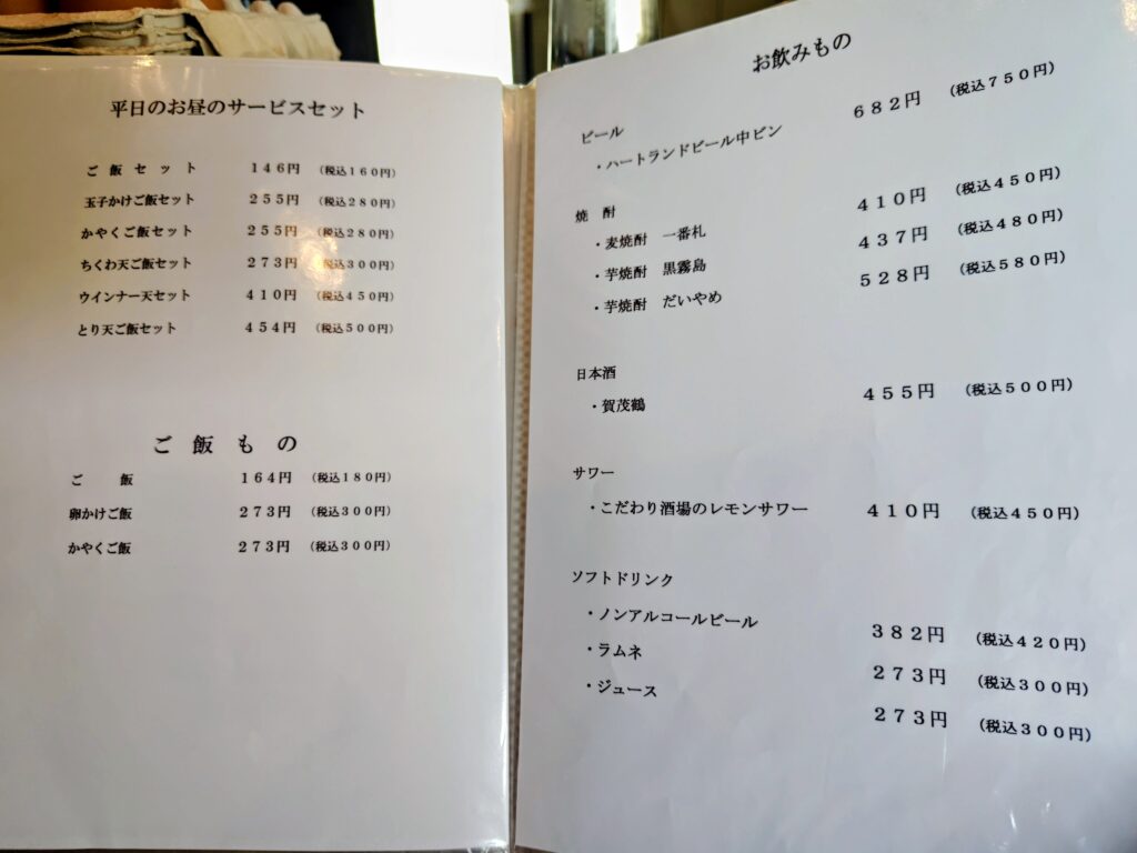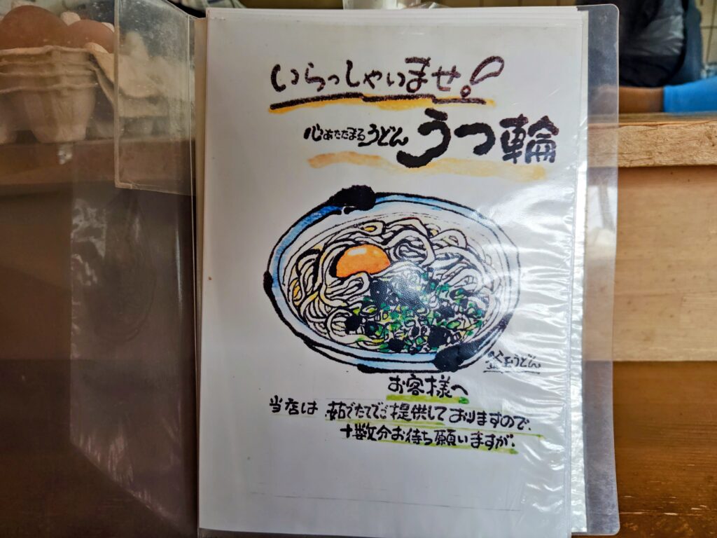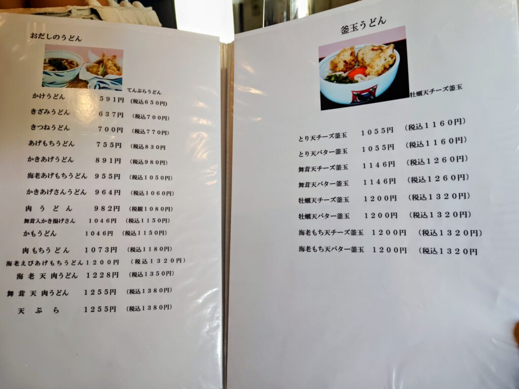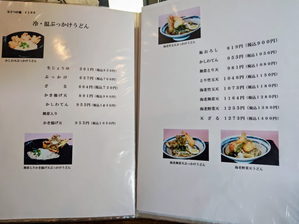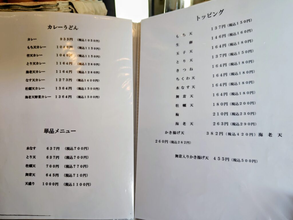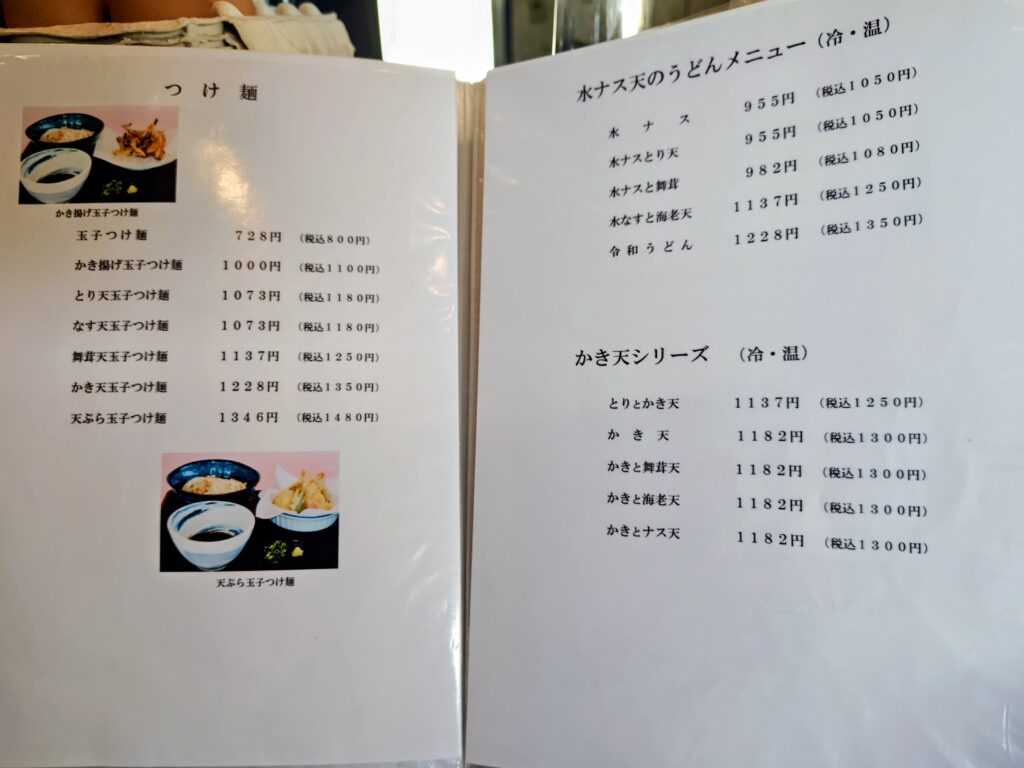 メニューは冷・温ぶっかけ、おだしのうどん、釜玉うどん、つけ麺、水ナス天のうどん冷・温、かき天冷・温、カレーうどん、単品、トッピング、平日お昼のサービスセット、ドリンクと驚く程の種類の多さ!!!