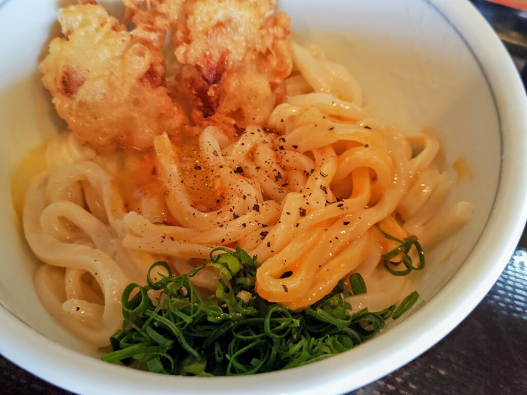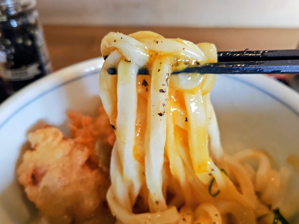 卵、チーズ、ブラックペッパーの組み合わせはうどん版カルボナーラ!