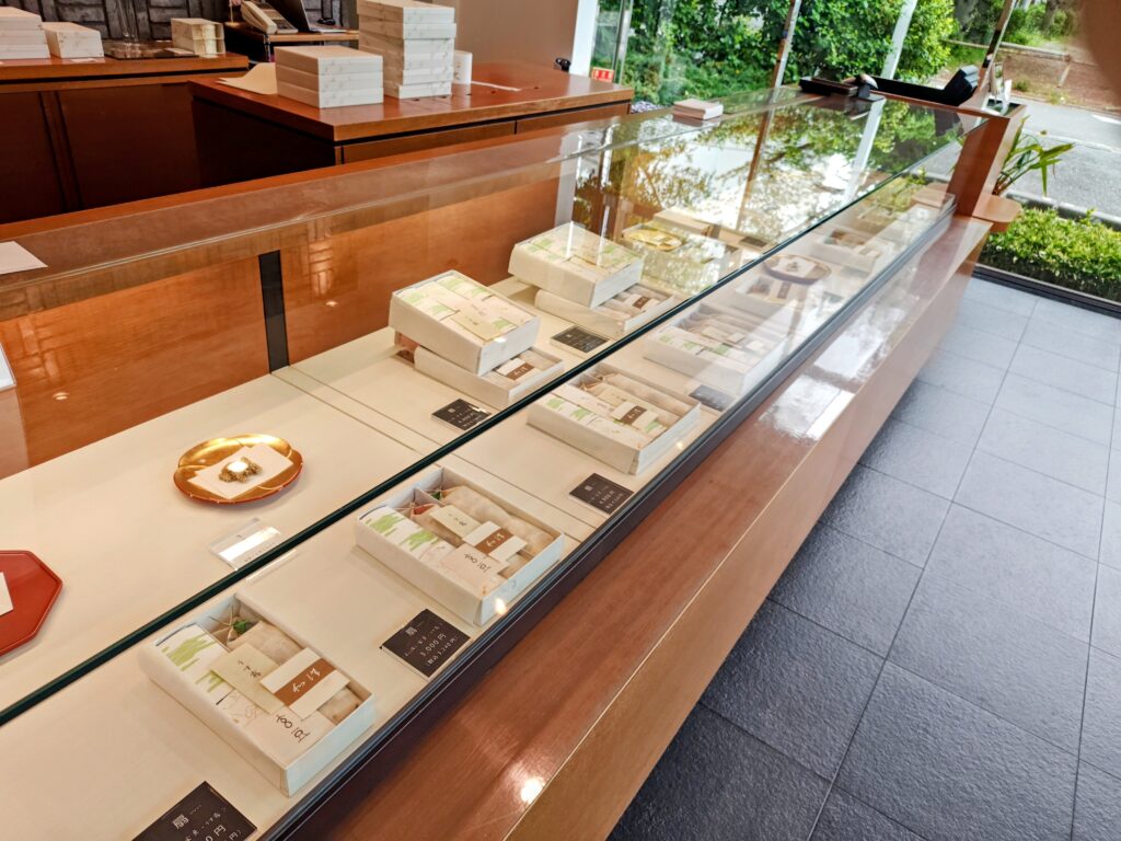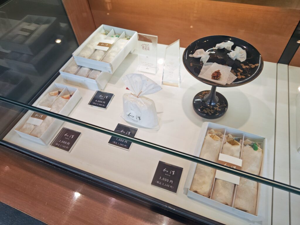 ガラスショーケースの中に和洋や扇等の詰合せ。和洋の箱は金額により複数で箱詰めされています。