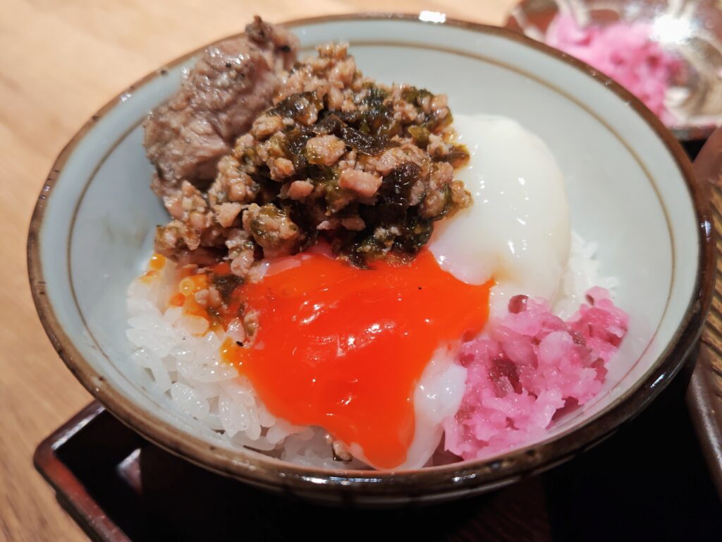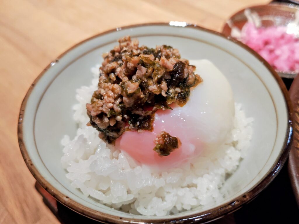 濃紅卵の濃厚な黄身とそぼろ佃煮がご飯に絡み幸せのひと時。